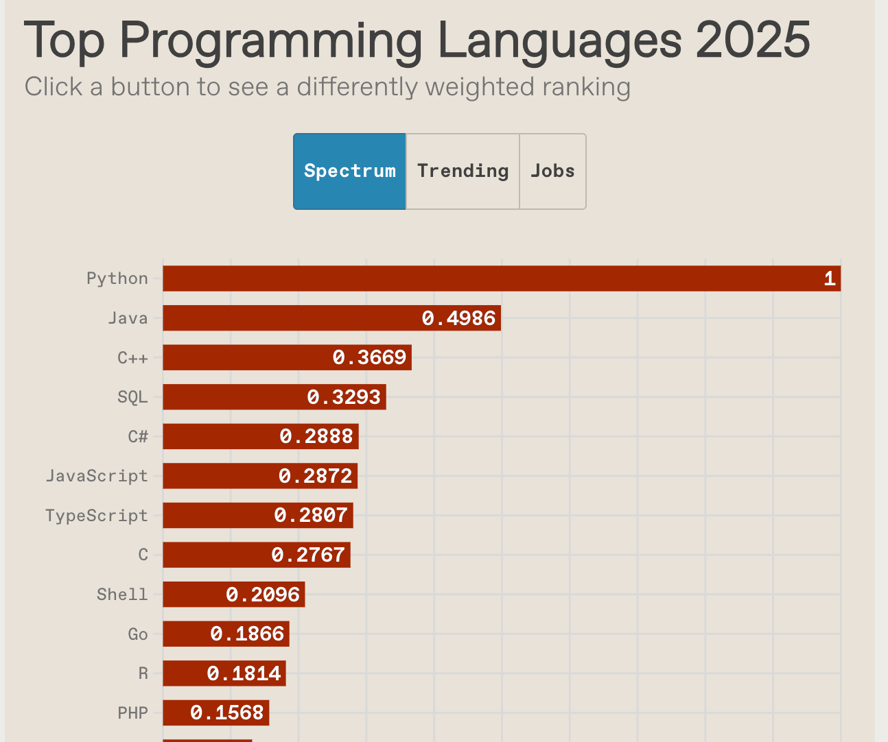 We start off with the results of Spectrum's survey. Check the article for their full methodology, but they essentially break down the results into the Spectrum, Trending, and Jobs rankings. The "Spectrum" ranking is weighted towards IEEE members, Trending takes things like Google search results and GitHub repositories into account, and Jobs is somehow measuring demand for different languages from IEEE's job board and others. All three have Python in the top spot.